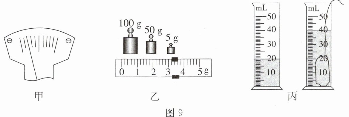 $g$,用量筒测得零件的体积如图 9 丙所示,零件的体积为20