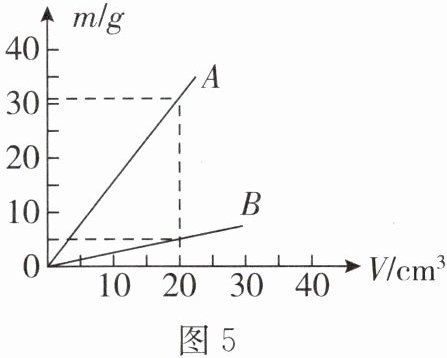 15. 如图 5 所示的是 $A$、$B$ 两种物质的质量 $m$ 与体积 $V$ 的关系图像。由图像可知,$A$、$B$ 两种物质的密度 $\rho_A$、$\rho_B$ 和水的密度 $\rho_{水}$ 之间的关系是