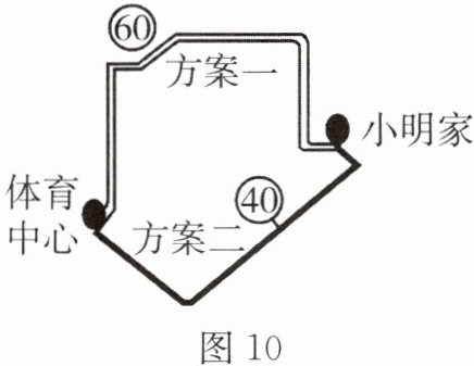 18. 周末小明和家人去省体育中心看球赛,汽车的导航系统提供了两种出行方案(如图 10 所示),图中圆圈内的数字为相应路线的限速提示。小明对比了两种方案:方案一,全程走高架路,路程 40 km,用时较短,但路程较长;方案二,全程走地面道路,路程较短,但因堵车高峰,用时较多。