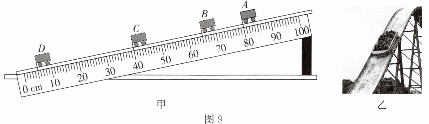 17. 在“测量小车沿斜面向下运动的速度”实验中,同学们将小车从 $ A $ 处静止释放,用频闪相机每隔 0.5 s 曝光一次,拍摄的频闪照片如图 9 甲所示。