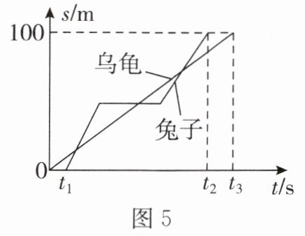 14. 龟兔赛跑是一个十分有趣的寓言故事。请仔细观察如图 5 所示的这幅新的龟兔百米赛跑的速度—时间图像。下列根据图像作出的四个判断中,不正确的是