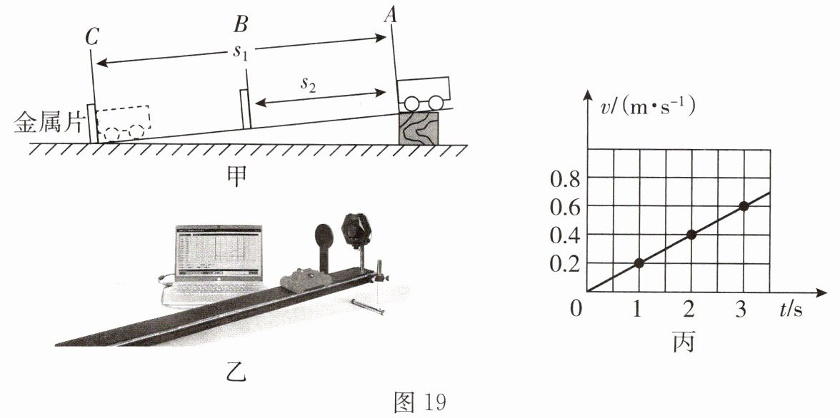 (4) 如图 19 乙所示,小组利用位置传感器记录小车的运动情况。位置传感器利用超声波测出不同时刻小车与它的距离,计算机就可以算出小车在不同位置的速度。屏幕图像如图 19 丙所示,横轴为时间,纵轴为速度,通过图像可以看出小车在斜面上下滑时是