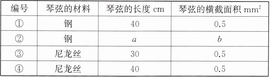 (3) 为了验证值想二,小明选用编号为①、②的琴弦进行实验,则表中缺少的数据:$a$ 应