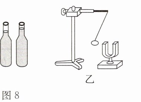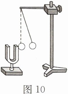 18. 如图 10 所示。用悬挂着的乒乓球接触正在发声的音叉,乒乓球会多次被弹开,由此可以得出的结论是:物体