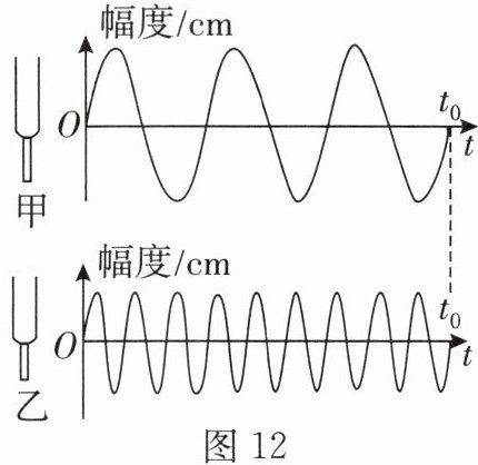 22. 在研究声音的特征时,音叉发出的声音特征可以通过“示波器”转化为波形图显示出来。在同样时间内,甲、乙两个音叉的波形图如图 12 所示。