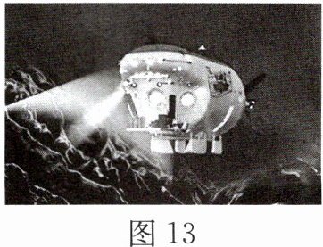 23. 2024 年 3 月 28 日,“奋斗者”号载人潜水器在完成深潜科考任务后返回三亚,这次任务带回了大量深海样本,并发现了多个深海新物种,如图 13 所示为“奋斗者”号在海底探索时的情景。“奋斗者”号可使用超声波在海底定位,在一次任务中,“奋斗者”号向海底发射一束超声波,在经过 6 s 后收到反射回来的信号,之后“奋斗者”号以 20 m/s 的速度匀速下潜。声音在海水中的传播速度为 1 500 m/s,求: