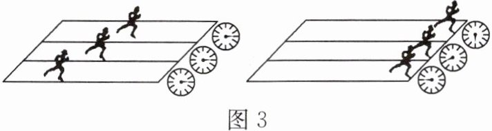 ,认为跑在前面的人运动得快;比赛结束后,“裁判员”通过相同路程比较时间