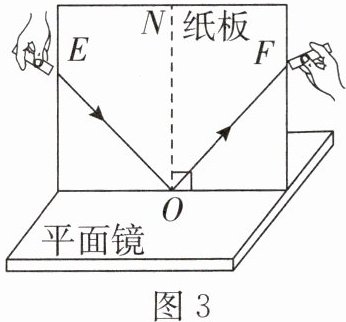 6. 如图 3 所示,为了探究光的反射定律,把一个平面镜放在水平桌面上,再把一张纸板 $ ENF $ 竖直立在平面镜上,纸板 $ ENF $ 是用两块纸板连接起来的,纸板 $ NOF $ 可以向前或向后折。使一束贴着纸板沿 $ EO $ 方向射到 $ O $ 点,下列说法正确的是
