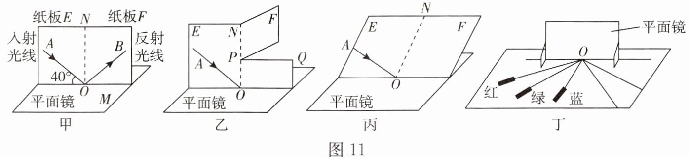 。(6) 如图丁,让红、绿、蓝三束不同颜色的激光射向平面镜的同一点 $ O $,其中蓝色激光垂直平面镜入射,在白纸上能看到两条红色光线和两条绿色光线,只看到了一条蓝色光线,这是因为当蓝色光垂直于平面镜入射时,入射角和反射角都等于