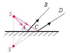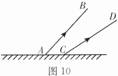 18. 图 10 中 $ AB $、$ CD $ 是由发光点 $ S $ 发出并经平面镜反射的两条光线,在图中画出 $ S $ 和它在平面镜中的像 $ S' $。