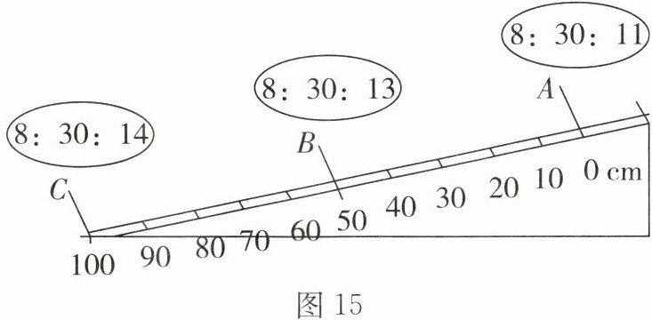 22. 小明在“测量小车运动的平均速度”的实验中, 设计了如图 15 所示的实验装置: 小车从带刻度的斜面顶端由静止下滑, 图中的时间是小车到达 $A$、$B$、$C$ 三处时电子表的显示时刻。