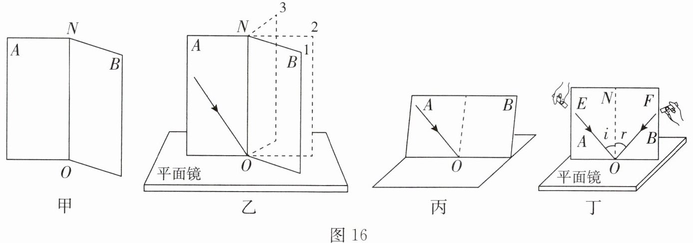 (2) 小华将光屏竖直立放在水平放置的镜面上, 让激光电筒发出的光沿光屏 $A$ 入射到 $O$ 点, 如图 16 乙所示, 然后旋转光屏 $B$ 的位置。实验发现, 当光屏 $B$ 的位置在 $1$、$3$ 时, 观察不到反射光, 光屏 $B$ 的位置在 $2$ 时才能观察到反射光。通过以上实验可知, 反射光与入射光处于