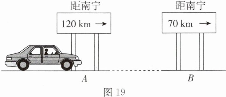 26. (6 分) 如图 19 所示, 轿车从某地往南宁方向匀速行驶。当到达 $A$ 地时, 车内的钟表显示为 10 时 15 分; 到达 $B$ 地时, 钟表显示为 10 时 45 分。求: