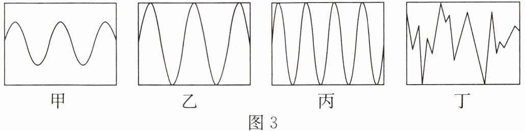 4. 如图3所示,分别是甲、乙、丙、丁四个物体发出的声音在示波器上显示的波形,下面关于四者发出的声音的特性描述正确的是