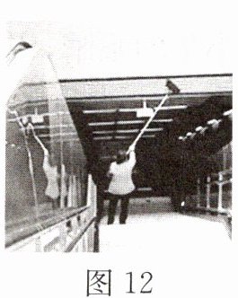 17. 如图12所示的LED的显示屏脏了,看到显示屏上字幕不停地滚动,一位保洁阿姨举着拖把放置在中间部位保持不动,她