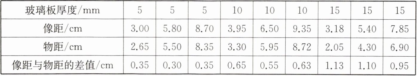 分析表格数据可得出像距与物距差值和玻璃板厚度的关系是