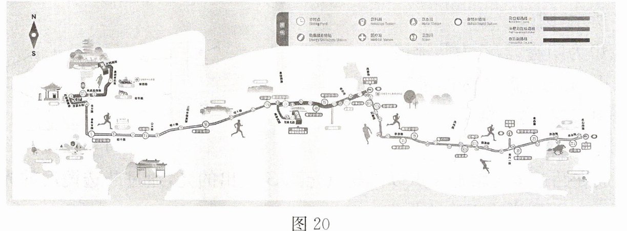 26. (10分)2024济南(泉城)马拉松于10月27日7时30分在大明湖风景区鸣枪起跑,共设置全马、半马和欢乐跑三个组别,赛事路线如图20所示。小超和爱好长跑的几位同学组队参加的是全程马拉松,途经经十路段(舜耕路至凤凰路)时,该路段全长13km,小超的平均速度是5m/s。求通过经十路段时: