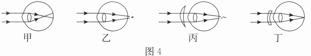 2. 据专家介绍,12 至 18 岁是青少年近视的高发期,主要原因如下:①长时间用眼不注意姿势或者休息。②长时间玩游戏、上网、玩手机、看电视等原因引起近视。图 4 中,属于近视眼及其矫正的是(