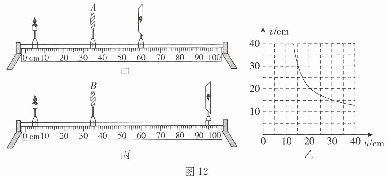 19. 在探究凸透镜成像规律时,如图12甲所示,将A凸透镜固定在光具座上35 cm刻度线处,将点燃的蜡烛放置在光具座上5 cm刻度线处,移动光屏,使烛焰在光屏上成清晰的像,由A凸透镜成像中物距和像距的变化关系画出图像如图乙所示;接着保持蜡烛的位置不变,将凸透镜A换为凸透镜B并保持位置不变,移动光屏,使烛焰在光屏上成清晰的像,如图丙所示。