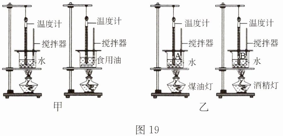 相等的水和食用油加热。(3) 在甲装置中,用相同酒精灯给两种液体加热相同时间,其目的是保证两种液体