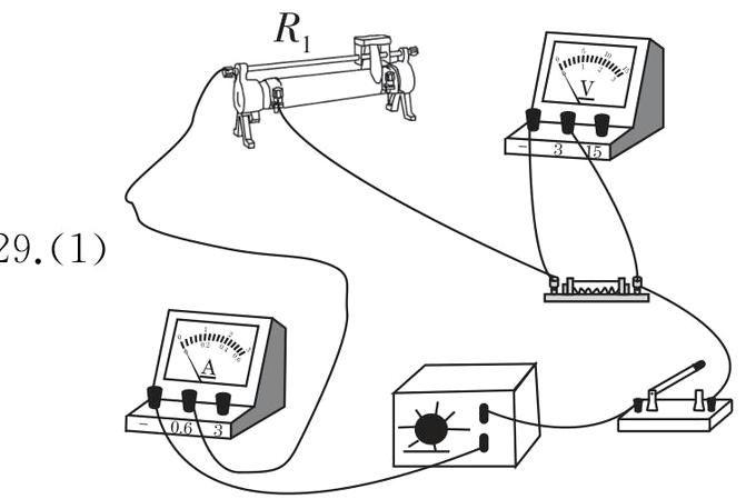29. 小明在实验室中找到学生电源、四个定值电阻(5 Ω、10 Ω、20 Ω、25 Ω)、“25 Ω 1 A”的滑动变阻器、电流表、电压表、开关及导线若干,探究电流与电阻的关系。