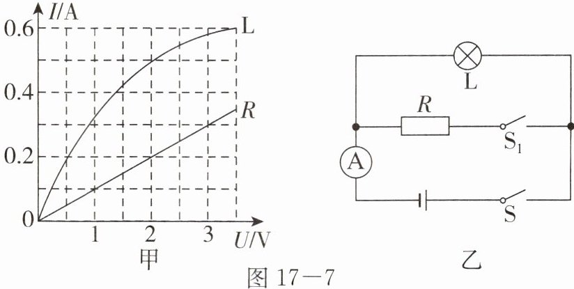 4. 图 17 - 7 甲是小灯泡 L 和电阻 R 的电流随电压变化图像,将它们按图乙所示接入电路中。已知该电路中电源电压是 2 V,则下列结论错误的是(