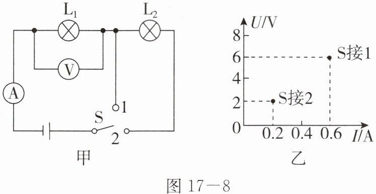 5. 如图 17 - 8 甲所示,当开关接 1 时灯泡 L₁ 正常发光,接 2 时灯泡 L₂ 正常发光。已知 S 由接 1 到接 2 时,电压表、电流表示数变化如乙图所示,则电源电压是