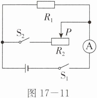 3. 在如图 17 - 11 所示的电路中,电源电压为 3 V 且保持不变,滑动变阻器 R₂ 标有“20 Ω 2 A”字样。只闭合开关 S₁,电流表示数为 0.3 A。