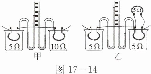 5. 如图 $17 - 14$ 所示是“探究电流通过导体时产生热量的多少与哪些因素有关”的实验装置,两个透明容器中密封着等量的空气。下列说法错误的是(