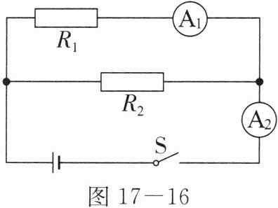 2. 如图 $17 - 16$ 所示,电源电压为 $9V$ 且保持不变。闭合开关后,电流表 $A_{1}$ 的示数为 $0.4A$,电阻 $R_{2} = 15\Omega$。求: