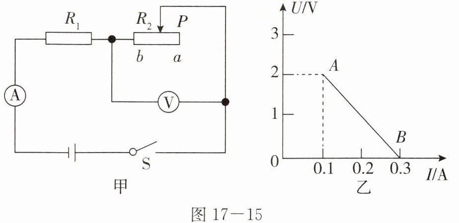 1. 如图 $17 - 15$ 甲所示,电源电压 $U = 3V$ 保持不变,闭合开关 $S$,滑动变阻器滑片 $P$ 从 $a$ 端移到 $b$ 端,两电表示数变化关系如图乙中线段表示,则滑动变阻器的最大阻值为