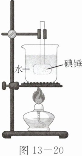 2. 碘锤是一种初中物理实验器材,其实是一个封闭的锤子形状的玻璃容器,里面装有碘颗粒。如图 13 - 20 所示,将碘锤放入热水中,观察到碘锤中的固态碘逐渐消失,紫色的碘蒸气充满碘锤。已知 1 标准大气压下,碘的熔点是 113.5℃,碘的沸点是 184.4℃,水的沸点是 100℃,据此可以判断出,实验过程中(选填“有”或“没有”)液态的碘出现,固态碘发生的物态变化是______(选填物态变化名称)。