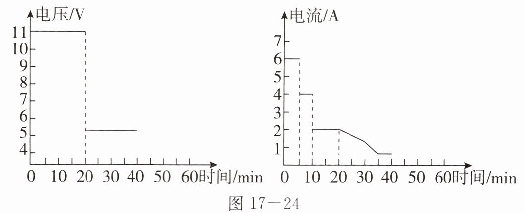 12. 手机充电时,充电器将 $220\ V$ 的电压降到 $5\ V$ 左右,充电器内部会有电流通过,但充电器插在插座上未接手机时,充电器内部也会有微电流通过。如果手机充满电后不及时与充电器断开,或长期不拔充电器,还会加速充电器内元件的老化,从而增加充电器发生短路和电压击穿的概率。有的充电器发热严重,外加居室环境密闭以及夏天天气炎热,就可能会引发充电器自燃自爆。目前“超级快充”技术可以不到 $10$ 分钟就把电池电量充达一半以上,极大方便了人们的使用。如图 $17 - 24$ 所示的是某电池充电过程中快速充电器输出的电流和电压关系,下列说法错误的是(