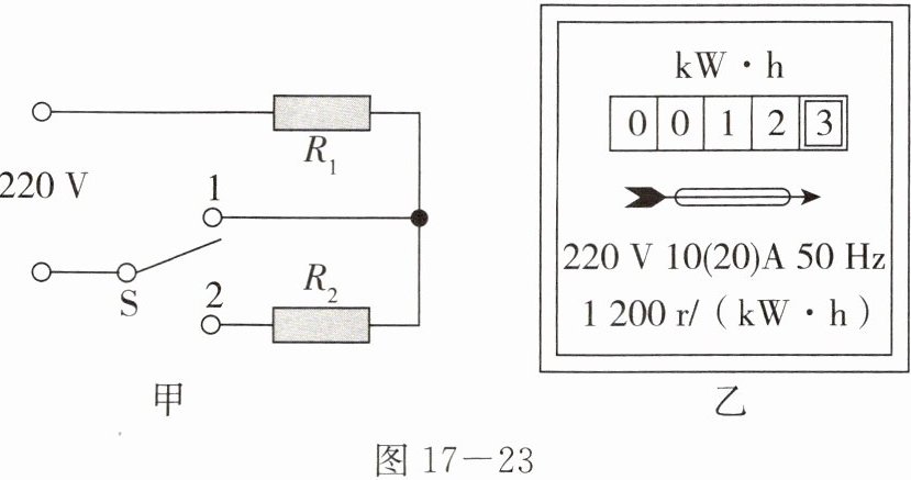 11. 某家用电热壶有“加热”和“保温”两个挡位,其简化电路如图 $17 - 23$ 甲所示,电热丝 $R_{1}=48.4\ \Omega$,$R_{2}=435.6\ \Omega$。小明为测量电热壶的实际功率,他把家中的其他用电器都与电源断开,仅让电热壶工作,$1\ min$ 内电能表的转盘转动了 $16$ 转,如图 $17 - 23$ 乙所示。不考虑热量损失,下列说法错误的是(
