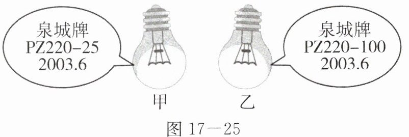 14. 甲、乙两只灯泡铭牌如图 $17 - 25$ 所示,不考虑温度对灯丝电阻的影响,将甲、乙两灯串联接在 $220\ V$ 的电路中,