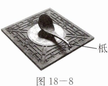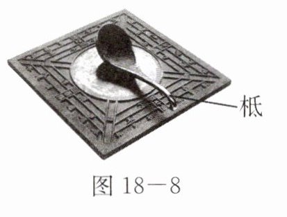 5. 指南针是我国四大发明之一,《论衡》中记载:“司南之杓,投之于地,其柢指南。”如图 18−8 所示的司南,是把天然磁石磨成勺子的形状,放在水平光滑的“地盘”上,“柢”指的是司南长柄。下列说法正确的是(