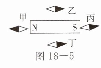 2. 如图 18−5 所示,一条形磁铁的周围放着能自由转动的小磁针甲、乙、丙、丁,这四个小磁针静止时,N 极指向画错的一个是(
