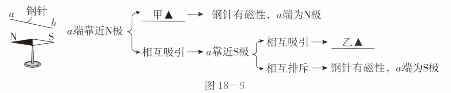 6. 小明在实验室发现一枚钢针,他利用小磁针判断:①钢针是否有磁性;②若有磁性,钢针磁极如何。小明为能快速判断,画了如图 18−9 所示思维导图,下列甲、乙处补充正确的是(