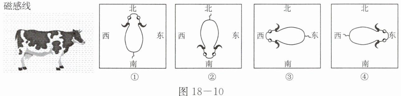 7. 美国《发现》网站于 2023 年 10 月报道:牛能感知地球磁场,吃草、休息时,其身体朝向习惯与地磁场磁感线平行(如图 18−10 所示)。为求证真伪,同学们设计如下实验方案:在四周无明显差异的草地上,多次观察牛吃草、休息时的身体朝向,若报道真实,则牛的身体朝向习惯性呈现四个场景中的(