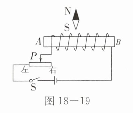 6. 在一次实验中,小红连接了如图 18 - 19 所示的电路。电磁铁 AB 正上方放有一小磁针。闭合开关,下列说法正确的是(