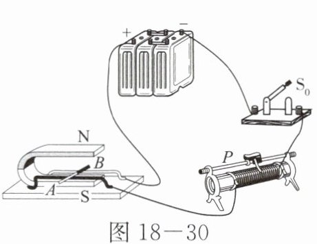 2. 借助如图 18-30 所示的实验装置,小明探究“磁场对通电直导线的作用”。闭合开关 $ S_0 $,原本静止的轻质硬直导线 $ AB $ 水平向右运动。要使 $ AB $ 水平向左运动,下列措施中可行的是(