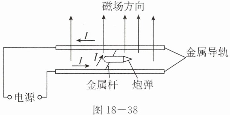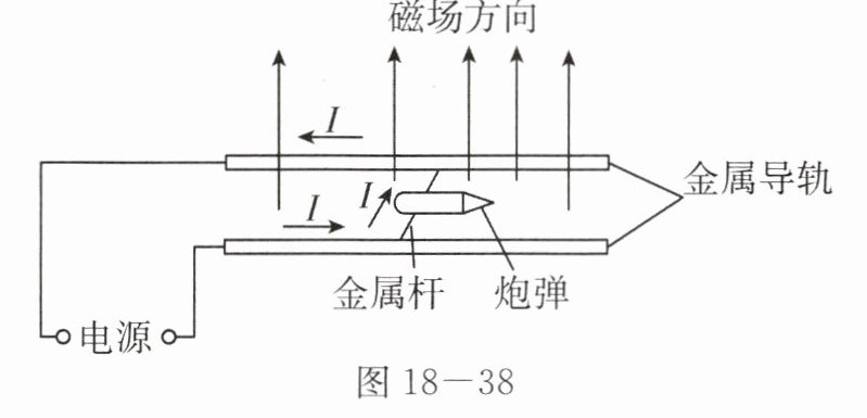 8. 我国电磁轨道炮近年来取得了重大进展。如图 18 - 38 所示,这是电磁炮的原理简化图。炮弹上固定的金属杆和金属轨道接触,并与电源构成闭合电路,通电后金属杆就会受到向右的力,于是将炮弹发射出去。则下列有关分析不正确的是(