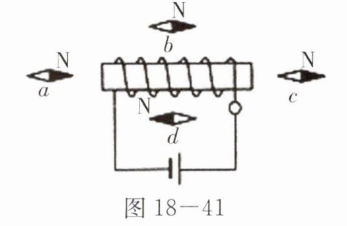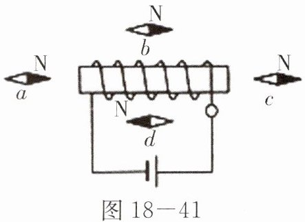 11. 如图 18 - 41 所示,通电螺线管周围的小磁针静止时,N 极指向正确的是(