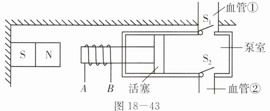 13. (多选)人工心脏泵可短时间代替心脏工作,其结构如图 18 - 43 所示,线圈 AB 固定在活塞的柄上,泵室通过单向阀门与血管相通。阀门 S₁ 只能向泵室外侧开启,阀门 S₂ 只能向泵室内侧开启。人工心脏泵工作时,以下说法正确的是(