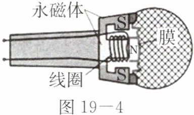 4. 仔细观察图 19 - 4 中话筒的结构示意图, 当人对着话筒说话时, 声带的振动会带动膜片的振动, 与膜片相连的线圈也跟着一起振动, 此时线圈就在磁场中做