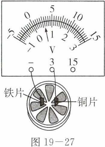7. 取一个橙子,把铜片、铁片插入其中,就制成了一个水果电池。用电压表测量电压如图 19-27 所示,下列说法正确的是(