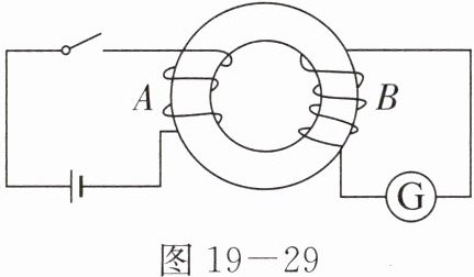 9. 如图 19-29 所示,把两个线圈绕在一个铁环上,线圈 A 接直流电源,线圈 B 接电流表。当线圈 A 的电路接通或断开的瞬间,线圈 B 中产生瞬时电流;当闭合或断开开关一段时间后,电流表指针不发生偏转。由以上探究可知,关于感应电流产生的条件,下列说法正确的是(