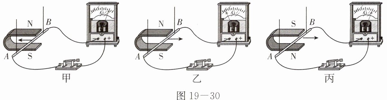 10. (多选)图 19-30 是小明探究闭合电路的一部分导体在磁场中运动时,产生感应电流的方向与哪些因素有关的实验情景。导体 AB、导线、开关和灵敏电流计组成闭合电路,导体 AB 用绝缘细线悬挂置于蹄形磁体的磁场中(图中箭头表示导体 AB 的运动方向),观察灵敏电流计指针偏转情况。下列说法中正确的是(