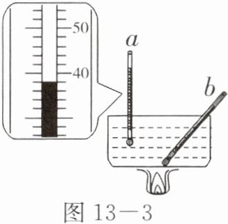 3. 如图 13 - 3 所示,给盛有水的烧杯加热,内有两支温度计 $a$、$b$,$b$ 温度计的示数始终比 $a$ 温度计的示数高,其原因是