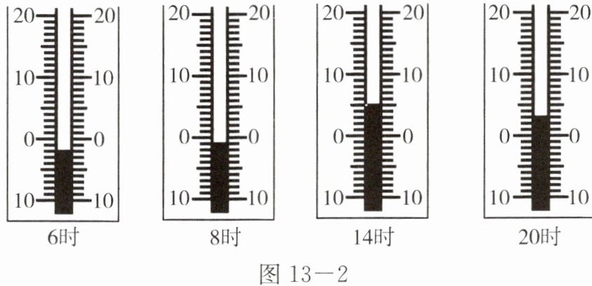 2. 春分时节,小明同学在自己家的阳台上用寒暑表测量气温,如图 13 - 2 所示,6 时、8 时、14 时、20 时这四个时刻的气温应记为: